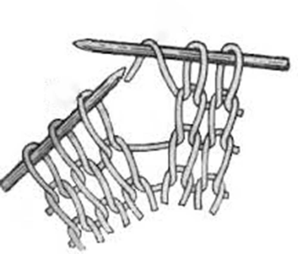 Набрать четное количество петель 28–30, провязать 10 рядов изнаночными петлями В 11 ряду комбинация из 1 накида и 2 лицевых петель будет повторяться до конца