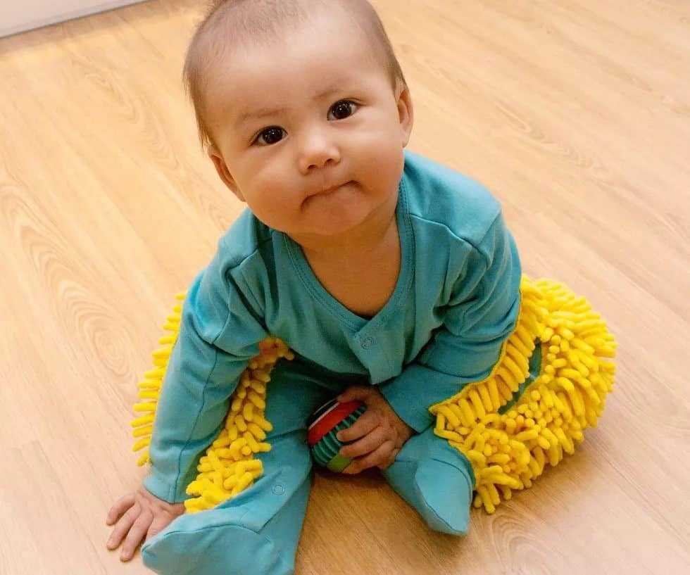 К обычному детскому костюмчику крепятся нашивки из микрофибры, которую обычно используют для изготовления швабр. Ребенок ползает по полу и одновременно собирает пыль.